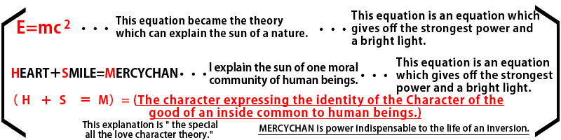 No14. 【Truth is a simple equation apparently. However ・・・・.】 E=mc2 Do you know the above-mentioned equation? This equation is a famous equation which the physicist's "Einstein" considered. This equation means "Changing to energy with slight merely immense mass." These contents are one of the important conclusions of the "special theory of relativity" of Einstein. This equation is simple apparently. However, this equation revolutionized the world. This equation is a source of nuclear development. This equation can explain the sun of the fixed star of the universe. That is, human beings got to know the truth of "substance = energy." Therefore, although this equation is simple, it is a surprising equation. The meaning of this equation is deep. I read many religion documents and philosophy books. I experienced the bottom of suffering of life. And the new field at which I finally arrived is "HEART + SMILE=MERCYCHAN." = The character of the special all the love character= The character for spiritual speed-per -second lighting. H+S=M This equation is simple apparently. However, this equation gives off the strongest power and a bright light. This equation was born by "Proof of human beings' goodwill." That is, this equation was born by the new field of "Man is the living thing of thank you." Although this equation is simple apparently, the contents have a deep meaning. The concrete contents should see the following related page. Human beings can start a spiritual revolution. It is because human beings proved existence of the "mirror cell" within a brain scientifically. Human beings can change by the "mirror cell." The method is the "GFIT method." Conclusion. ・・・・ Apparently, although these two equations are simple, they have a deep meaning. ※ E =mc2 became the theory which can explain the sun of the universe (or nature).