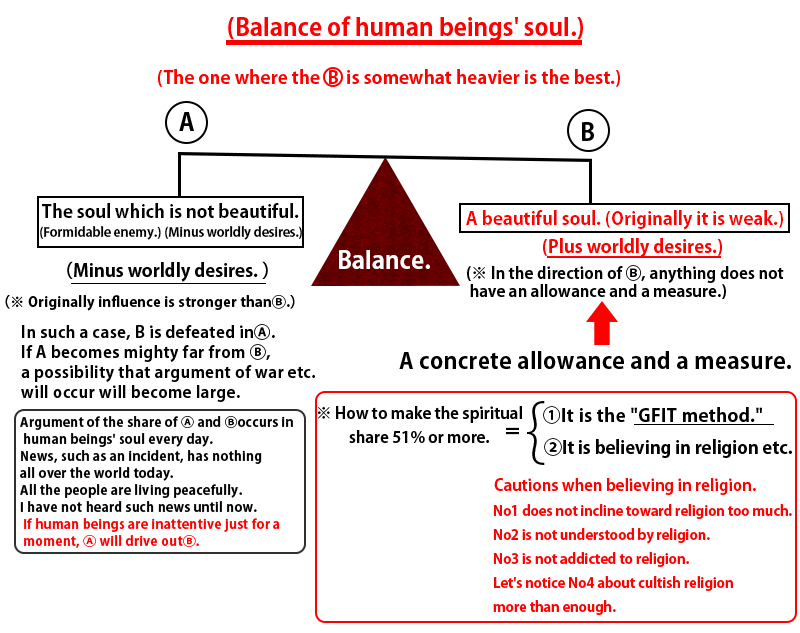 To all the people in the world to respect. Writer・・・Harunobu Kodama Human beings own many tools containing the arms which kill man now. There are many the useful vehicle and track which human beings invented, an airplane, a rocket, a forklift, a machine, a kitchen knife, knives, guns, dynamites, etc., and they are in it. Human beings' greatest homicide arms are nuclear bombs. All of those things become useful by the view of man's good. However, man may abuse those convenient things. Especially powerful arms are important in order to keep state defense, a national life, and property. When it is thought that man wants to use those things for homicide, those convenient things change to a killing machine altogether. Even if it thinks that I do not abuse a car, many people are dead in the accident all over the world almost every day. However, those useful things are not thrown away just because human beings are so. It is because those things became a required thing indispensable to progress and a life of human beings' civilization, or defense. It is thought that human beings' peace is maintained by existence of a nuclear bomb. I may be scolded by people who claim that abolition of nuclear weapons asserts such a view. However, it is one truth. Man is the living thing which has the foolish side apparently although you seem to be wise. World War II is proving it. Thus, all the convenient wonderful things that human beings invented have a merit and a demerit. Human beings have to recognize that. If it thinks that man will kill man, man can use anything. In it, poison, a chemical weapon, a biological weapon, a poisonous snake, a scorpion, a steel pipe, a stone, an electric saw, etc. are contained. “The Aum Shinrikyo” of the religious group started the "sarin nerve-gas attack on the Tokyo subway system" in Tokyo in Japan on March 20, A.D. 1995. This incident is a "coordinated-terrorist-attacks-incident” using the Sarin of the chemical weapon. When it thinks that man will kill man, even if there are no existing arms, man manufactures powerful arms, also even by man's manufacturing himself. Man needs to study that. If man has a place which sells a nuclear bomb, mancan also buy it. In the sarin nerve-gas attack on the Tokyo subway system, the criminal used the Sarin of the chemical weapon manufactured itself. They designed the sarin production plant themselves and worked the manufacture plant. And they made Sarin. They insisted that they were manufacturing agricultural chemicals at first. All Japanese was deceived by them. Nobody thought that Japanese people were manufacturing such a dangerous chemical weapon by no means. Thus, man is a living thing which manufactures the powerful arms etc. in which homicide is possible, even when it thinks that man will kill man and there are no arms in the surroundings. Therefore, even if arms etc. are regulated or it carries out abandonment etc., man will manufacture powerful homicide arms himself. Moreover, man may supply the powerful arms more than the arms regulated and discarded. Man has to learn that from this incident. In the United States of America, the airplane was used in the coordinated-terrorist-attacks incident which occurred on September 11, A.D. 2001. Thus, man uses anything, when it thinks that man will kill man. And man thinks that man will supply even from where. It is because man has a bad soul. It is because man's brains are used in the bad direction. Then, I advance a view one step. When man can do neither abandonment nor regulation nor disposal in a convenient thing with those merits and demerits, what should man do? The answer considers that I reform man's soul. Because, man is from "all that man emits come out from a soul." It is because a view to abuse also comes out of a soul. The convenience of civilization is usually employed by the soul of man's good. However, man may change his soul suddenly under the influence of illness, a radical belief, etc. When applied by the human being with whom the convenience of civilization was filled in malice by the unusual soul, the convenience changes to a killing machine etc. A kitchen knife and a knife are frequently used for homicide. However, those weapons are not criticized. It is because neither the kitchen knife nor the knife considers that people are bad. Man's soul considers clearly that people are bad. All the weapons change to the tool etc. which kill man by man's malicious soul. Therefore, no weapons are bad and there is a problem in the soul of the human being who employs it. Under those circumstances, Human beings have to make an effort to stop eternal homicide. The efforts are efforts to reform human beings' soul. The activity which creates the soul which I do not consider that man will kill man is important. I consider the activity to be one fundamental solution.(=The spread activities of MERCYCHAN of human beings' identity.) It is because man's soul kills man.