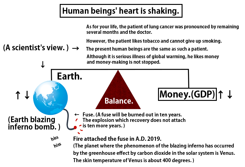 ◎A shout of human beings.・・・(Since human beings have various views, they are not collected easily. ) 1 Advanced nations have taken out many profits according to the industry of former many. From now on, we the underdeveloped countries take out many profits and become rich. Advanced nations emitted carbon dioxide in large quantities, and became rich until now. We become rich shortly. It is wrong to force restriction of carbon dioxide on us now. 2 Advanced nations caused global warming. Advanced nations should take the responsibility for global warming. 3 Global warming is delusion without a basis. ※Various opinions of human beings are flying about by the difference in a position now. Intellectually, human beings understand the problem. However, human beings cannot solve a problem easily by various bondage. Human beings' heart is shaking. However, there is no time which human beings are establishing easy. Ten years have said the scientist as the match after this. Human beings need to prevent global warming in ten more years. If a scientist adopts no measures over ten years, I will warn that the earth becomes a situation which recovery does not attach. ◎The present human beings need to devise the money-making which does not emit carbon dioxide. And the present human beings need to develop the technology of burying carbon dioxide in the earth efficiently. Then, human beings may be able to prevent global warming. 【Human beings have the character which cannot be performed even if he understands intellectually.】 Even if human beings understand that I must not do, they have the character in which I cannot stop it. It is like it drinking alcohol, if you like alcohol and it hides from a doctor irrespective of the doctor's inhibition having started, even if liver is bad and in the hospital. Even if the result of dying is known, human beings cannot stop alcohol. With the head, if alcohol is drunk, it turns out that a life is shortened, but I cannot stop alcohol. Prevention of global warming has such the whole surface. It is because human beings' desire has stood with its legs wide apart. Proposal. I think that it is a thing it is better to have changed how to call "global warming" and to consider it as "earth blazing inferno-ization." Do you hear "global warming" and feel a sense of crisis? I think that this name is too gentle. The words which human beings disseminate say "this district is warm good land" or "since the climate of this district is warm, it is the highest." By such a reason, I consider a way of speaking called warming as it is better to stop. Warm language contains the meaning that it is comfortable. How do you think? The phenomenon which cannot be accepted exists in human beings' world. Circular constant.・・・・・ I expressed suddenly the number of such a circular constant that cannot be accepted. Why did I express such a number? This is because the feeling which cannot be accepted in the feeling of the heart exists. Please see the following figure. 【The depth of the heart to which human beings got damaged.】 ◎ The crack of the heart appears as human beings' minus worldly desires. The feeling which cannot be accepted serves as the depth of the crack of the heart, and appears. Typical minus worldly desires are hatred and revenge.