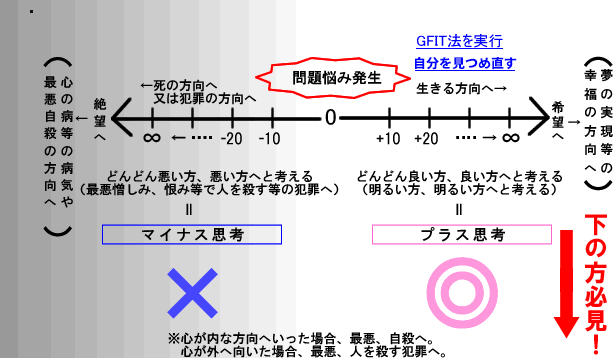 上記の左側のマイナス思考は無視して下さい。問題、悩みが発生したときプラスの方向へ考え方を変える事ができれば解決の方向へ向かいます。このホームページには考え方をプラスの方向に変えるコツの一部を紹介しています。