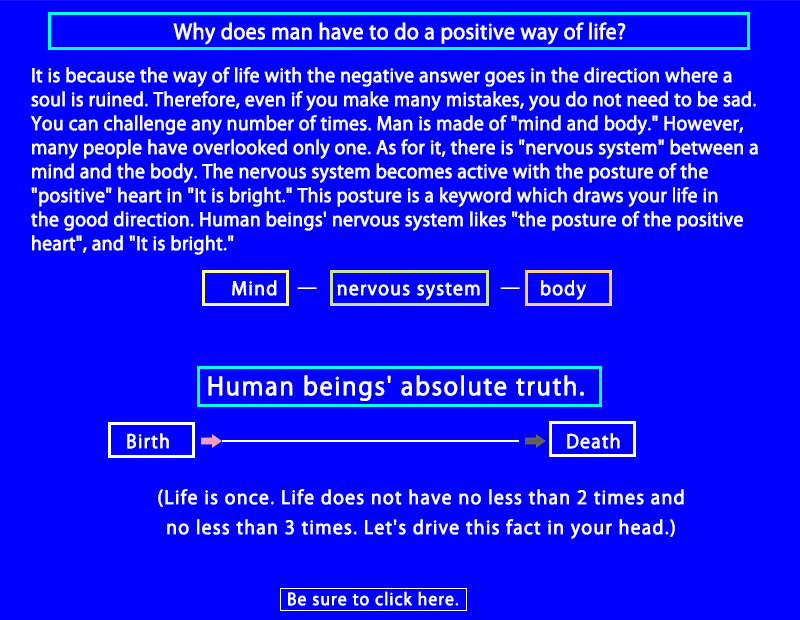 ※ You must not cause trouble by explosion of hatred in life. You must not commit suicide according to the occurrence of minus of life in life. The answer for redoing life is in this homepage. Man is a living thing which can be redone in any worst lives. The internal organs for redoing life are neither liver nor the heart. The internal organs in their duty for redoing are the brains in the head. The brains in this head are internal organs which think of "the good and wrong." And the brain is all governing you. A brain kills man or carries out the command which I employ efficiently. Brains are internal organs which create an infinite thinking circuit. What kind of thinking circuit do create in such a brain to pulverize the wall of life? And is hope produced in what kind of thinking circuit? Thus, the thinking circuit of the brain in the head is an important point which creates your happiness. Hope and happiness are born by the change of the thinking circuit of this brain, and the scenery of the heart. I exhibit that concrete method into this homepage.