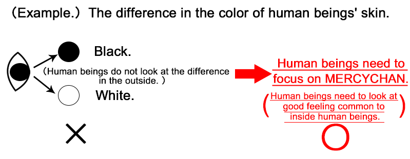 Human beings can solve the issue of racism by the difference in the color of skin by turning a viewpoint to MERCYCHAN of human beings' identity. It is because change will occur in a soul if human beings change their viewpoint.