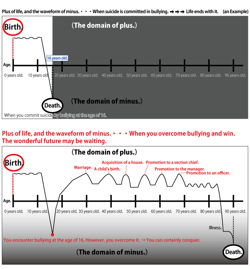【Plus of life, and the waveform of minus.】・・・Life is a repetition of the occurrence of plus and minus. Therefore, you must not commit suicide according to the occurrence of minus. Why is it? Please consider the whole life from the following waveform and consider the answer.